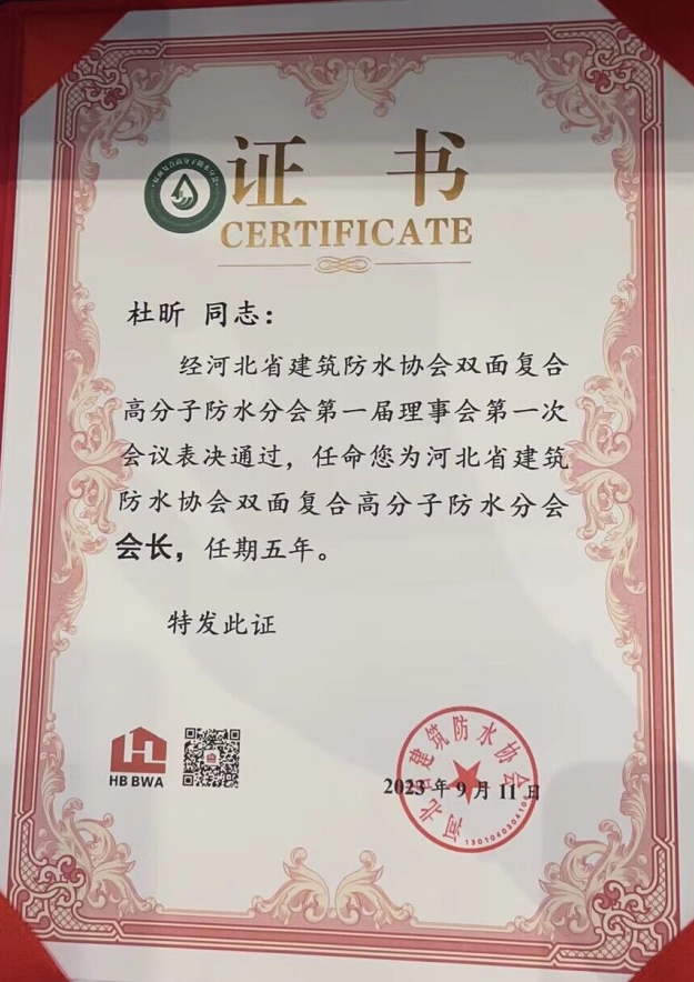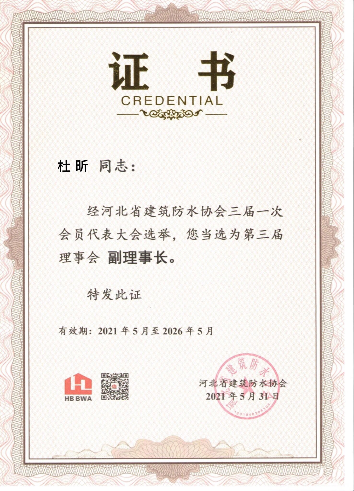 • 杜昕任北京建設工程物資協會防水分會副會長